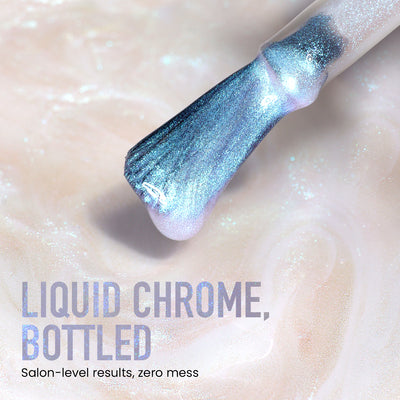 A first-of-its-kind lakur finish that provides an instant metal shine and an ethereal sheen chrome look without the fuss of powders or UV lights. This new effect finish can be worn on its own or layered to instantly transform any lakur, giving regular polishes (and even bare nails) a modern effect that shifts and shines with every lighting. There’s no curing required, much less the potential of a mess: simply paint on for an instant chrome transformation.