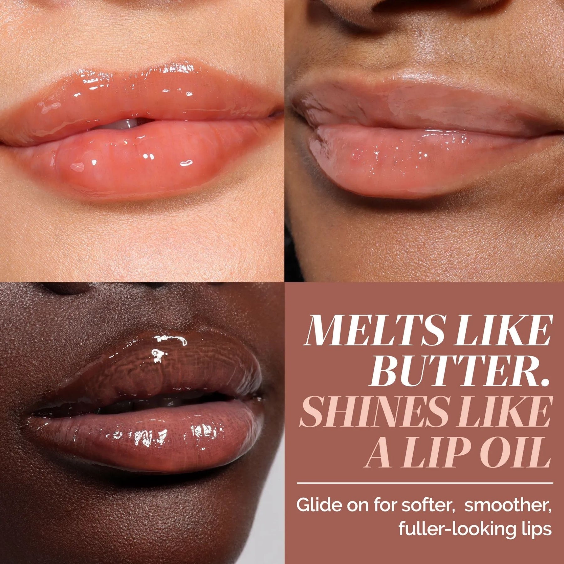 Apply Quench Glow Buttery Lip Oil directly to your lips. Wear it alone for a glossy, nourished finish, or layer it over your favorite lip color. Reapply when needed for continuous hydration and a plump, glossy shine.