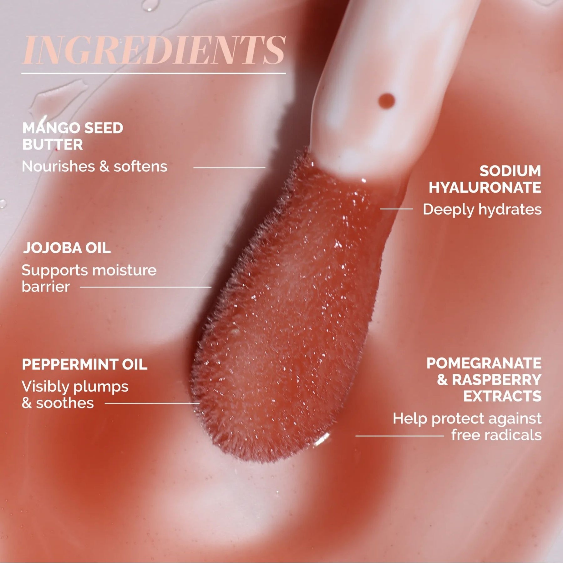 Hydrogenated Poly(C6-14 Olefin), Phytosteryl/Isostearyl/Cetyl/Stearyl/Behenyl Dimer Dilinoleate, Polybutene, Mango Butter Dimer Dilinoleyl Esters/Dimer Dilinoleate Copolymer, Ethylene/Propylene/Styrene Copolymer, Squalane, Simmondsia Chinensis (Jojoba) Seed Oil, Helianthus Annuus (Sunflower) Seed Oil, Mentha Piperita (Peppermint) Oil, Mangifera Indica (Mango) Seed Butter, Butyrospermum Parkii (Shea) Butter, Punica Granatum Flower Extract, Ricinus Communis (Castor) Seed Oil, Rubus Idaeus (Raspberry) Fruit Extract, Rosmarinus Officinalis (Rosemary) Leaf Extract, Tocopheryl Acetate (Vitamin E), Ethylhexyl Palmitate, Butylene/Ethylene/Styrene Copolymer, Polyglyceryl-3 Diisostearate, Ethylhexylglycerin, Silica Dimethyl Silylate, Pentaerythrityl Tetra-di-t-butyl Hydroxyhydrocinnamate, Butylene Glycol, Pentylene Glycol, Isopropyl Titanium Triisostearate, Sodium Hyaluronate, Tocopherol, Citric Acid, Limonene, Phenoxyethanol, CI 77891, CI 77491, CI 77499, CI 77492